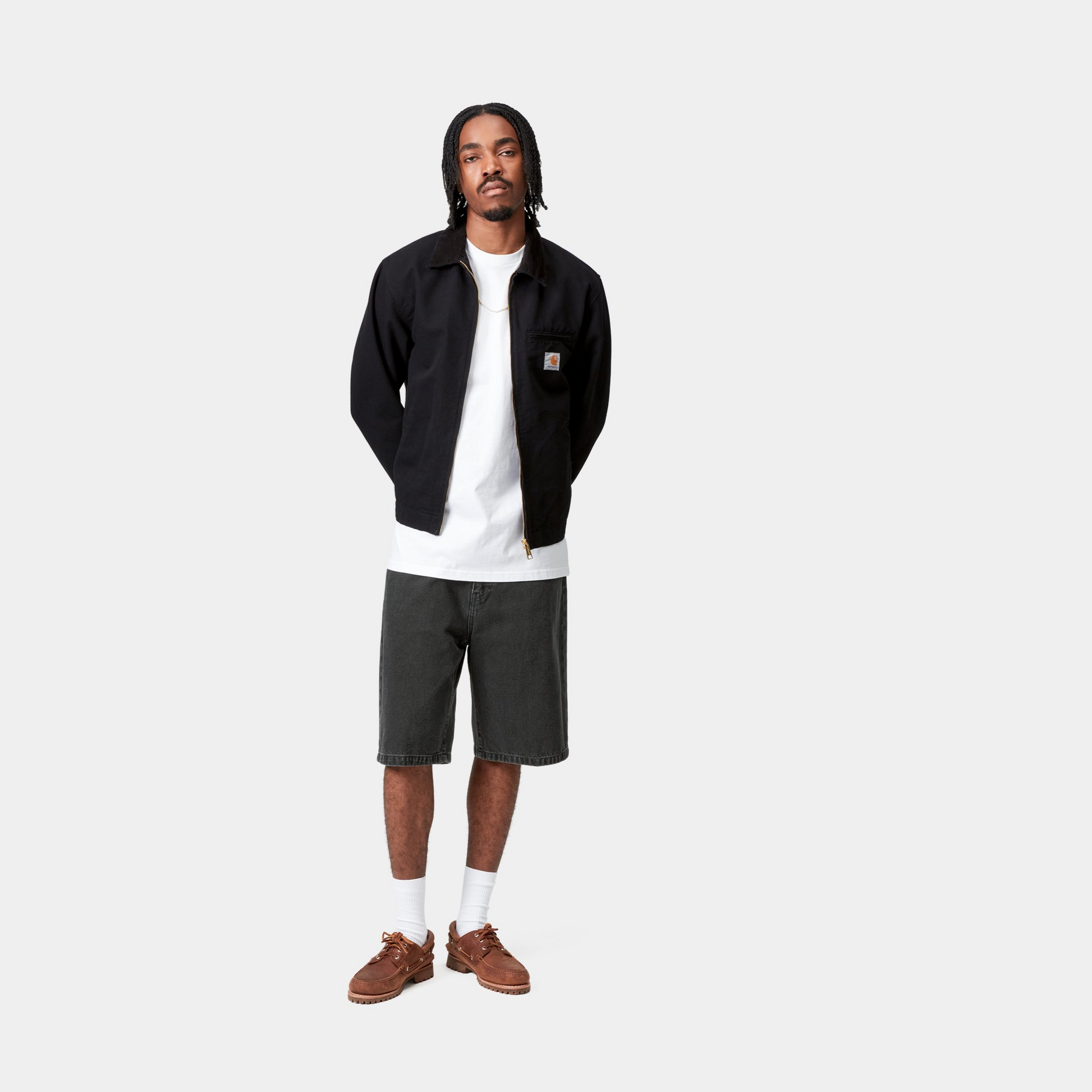 The Landon Short, a loose fit with a regular waist, is made from heavyweight textured cotton denim. The five-pocket design features a square label at the back.