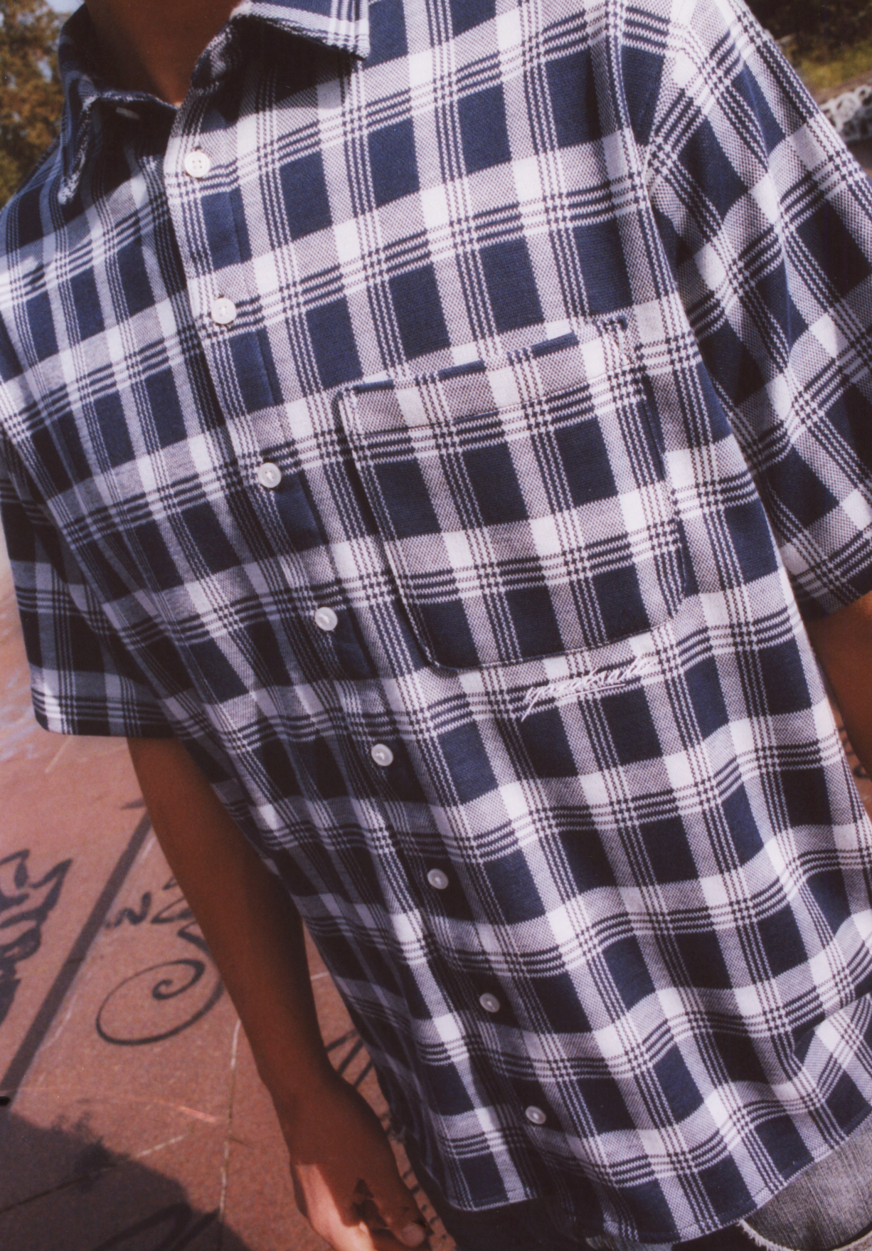 Embroidery below pocket.